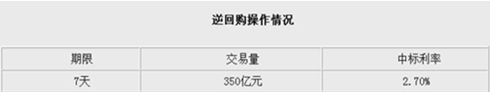 据中国人民银行网站消息,人民银行于本周四(6月25日)以利率招标方式开展了逆回购操作。期限为7天,交易量为350亿元,中标利率为2.70%。此前中国央行已连续19次暂停公开市场操作。