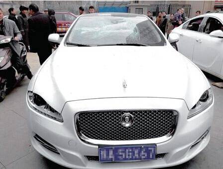 4辆车主要损坏部位都是车玻璃,其中捷豹的右侧车灯也被砸坏,别克君威的前后挡风窗、两侧车窗几乎全部被砸掉。