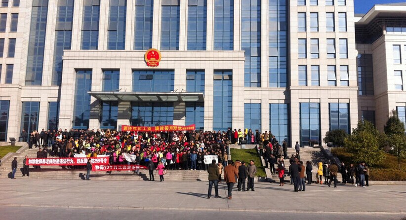 2014年12月22日上午,河南固始县近1000名教师集体罢工走上街头要说法。现场的教师告诉记者,原因是此前半年绩效工资迟迟才发,而后承诺的涨工资没有实现,每个月还要扣掉18%。